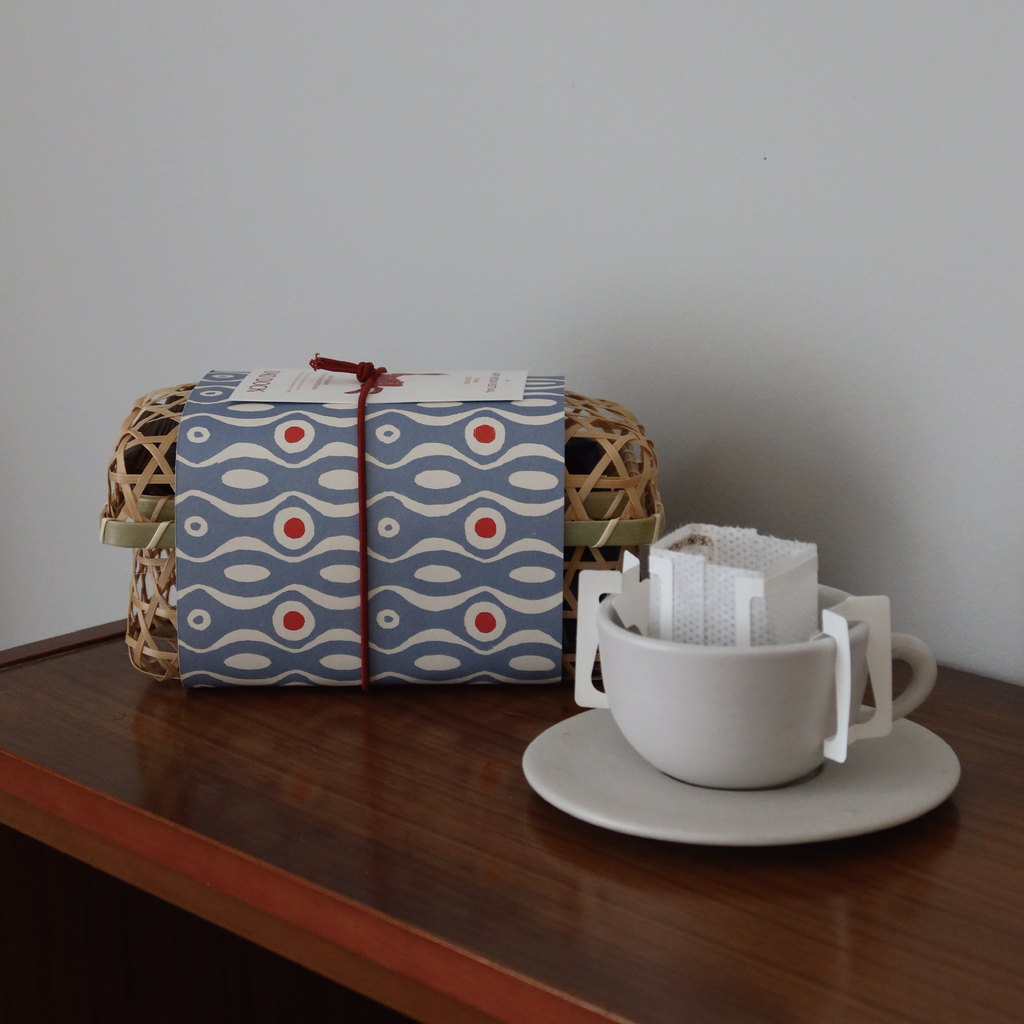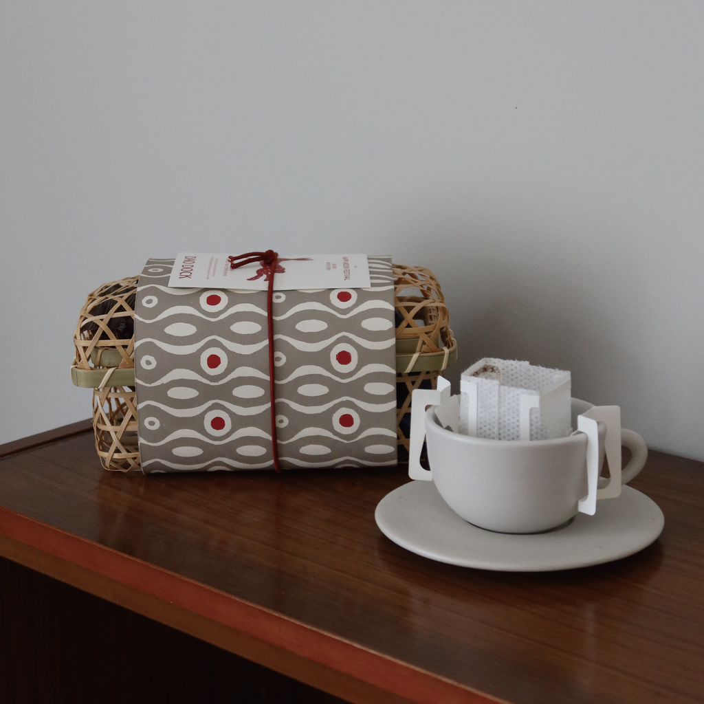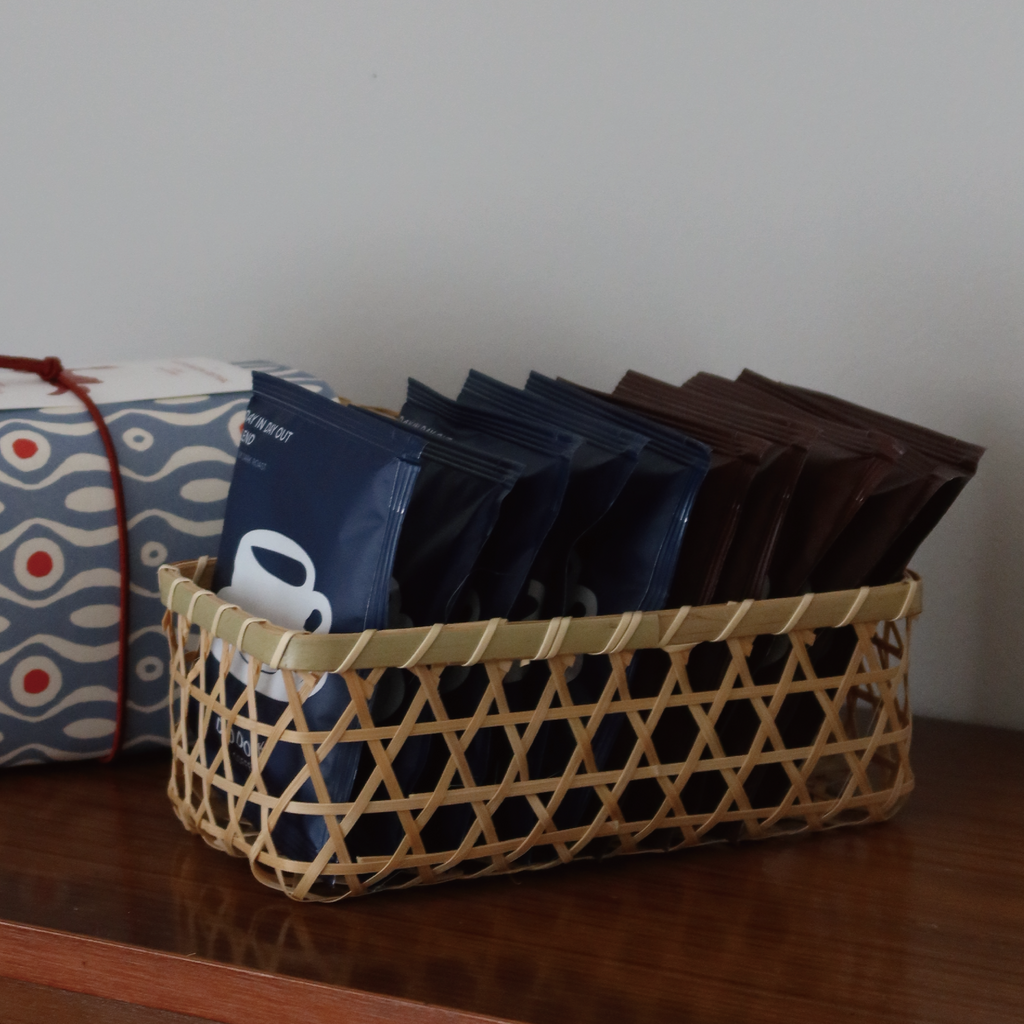 Enjoy a handmade bamboo gift basket filled with our specialty drip coffee bags — a gift of coffee to celebrate moments of connection and appreciation.